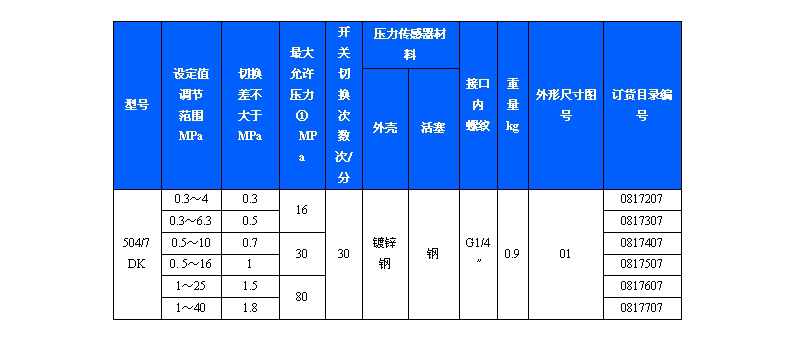 504/7D壓力控制器采用帶泄油口的活塞式傳感器,可用于中性液壓油等介質。504/7D壓力控制器的設定值可調,調節范圍0.3~40MPa。